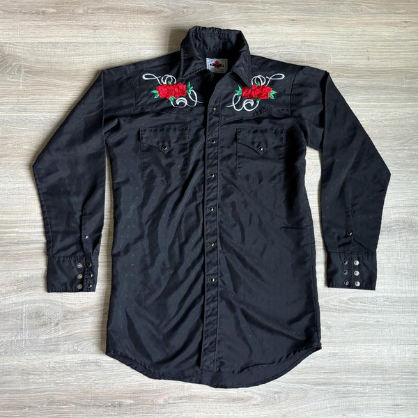 Sm/Med - Vintage 70s MWG Black Double Diamond Polyesyer Western Pearlsnap Shirt w/ Embroidered Roses
