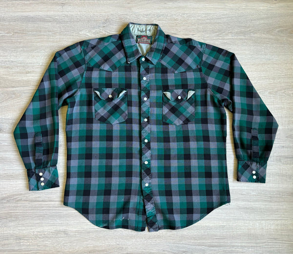 M/L - Vintage 80s Greatland Green Black Gray Plaid Flannel Western Pearlsnap Shirt