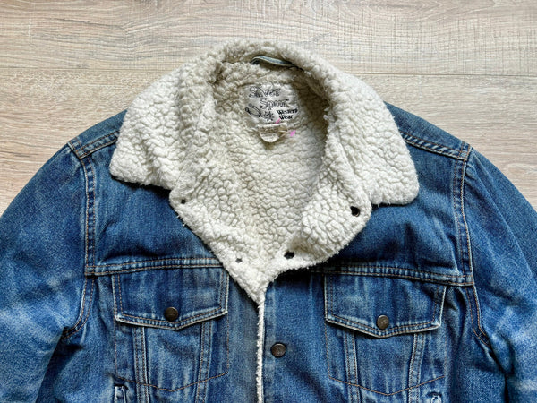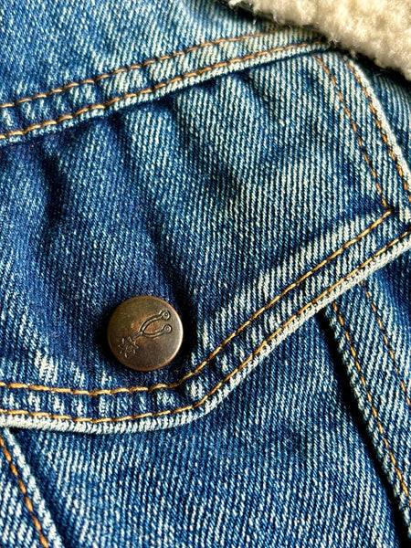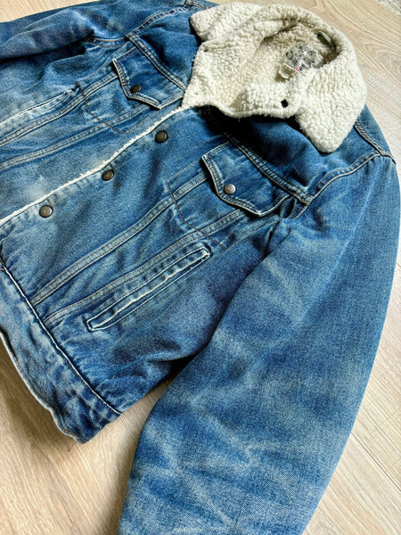 100% cotton denim jacket with sherpa lining in the body and the collar, as well as quilt lined sleeves. It is in excellent condition for its age and has some fantastic patina! Great whisker lines on the sleeves and across the chest.