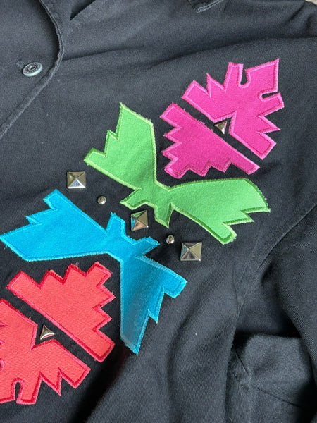 Oh man! This jacket is about as rowdy as it gets with bold Aztec design and silver tabs sewn in
