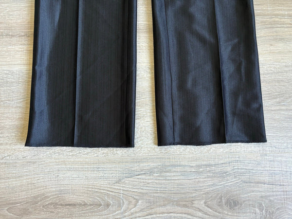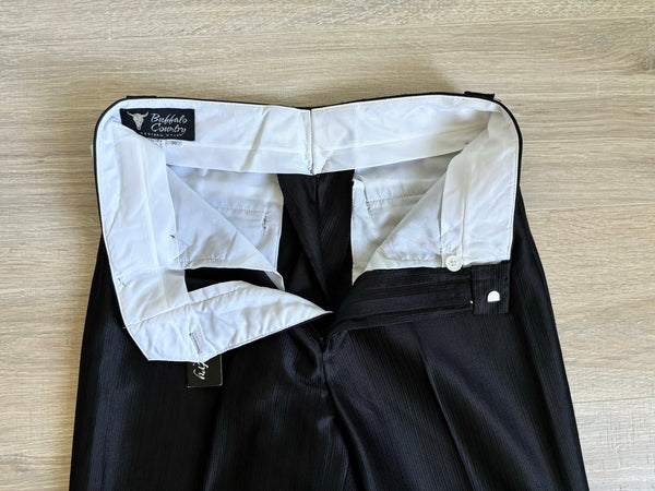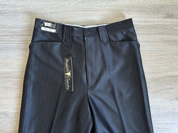 Incredible pair of black polyester western pants with all the fixins. Complete with pearl snap back pockets and arrow belt loops. Unhemmed cuffs so that you can get them tailored for your exact length.