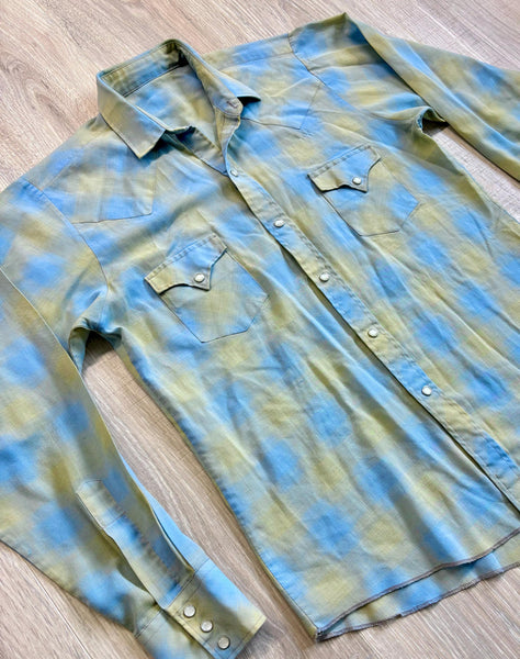 Small - Vintage 60s Blue/Green/Yellow Plaid Western Pearlsnap Shirt