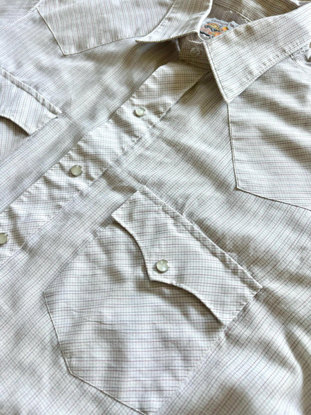 Med/Lrg - Vintage 80s ATB Western Cream Thin Lined Plaid Short Sleeve Pearlsnap Shirt