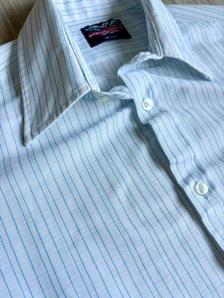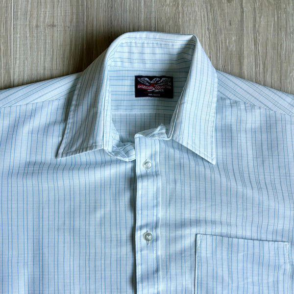 Medium - Vintage 80s White / Blue Striped Polyester Americana Collection Short Sleeve Button Up Shirt
