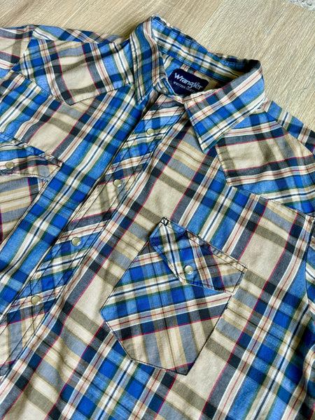 XL - Vintage 90s Wrangler Beige / Blue Plaid Western Short Sleeve Pearlsnap Shirt
